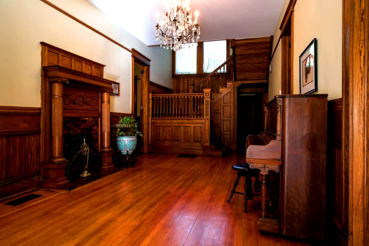 The grand living spaces, all capped by 12-foot ceilings, consist of two parlors, a lounge, an expansive wood-paneled dining room and a billiard room with a vintage organ and fireplace.